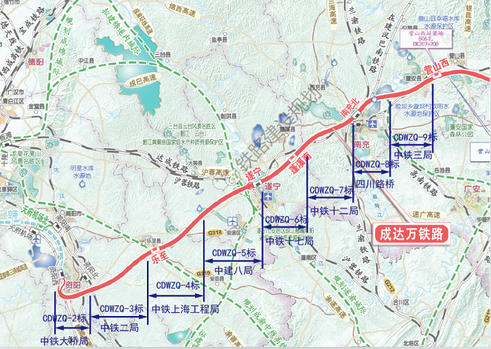 CDWZQ-5, the number of projects is: 41 bridges/19.949km; 49 roadbeds/10.059km; 11 tunnels/2.585km; 107 holes of box girder frame and bridge deck system; transportation and installation of double-block ballastless ballast bed and sleepers in this bid section and Suicheng tie line, DK330+000~DK335+213.831 section; 74.716km for ballastless ballast bed pouring and turnout in turnout area Installation and commissioning. The key control projects are: Cross-Sui-Nei Expressway Super Bridge, Degong Village Super Bridge, Bai'an River Super Bridge, and Mazitan Reservoir Bridge. Involved in the construction of business lines: Suining Station, Degong Village Bridge. Mileage/range: DK335+213.831~DK367+795.350, main line length 32.589km.