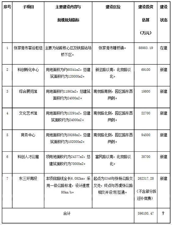 项目建设主要内容包含张家港市客运枢纽、科创孵化中心、综合展览馆、文化艺术馆、商务中心、科创人才公寓、东三环南段共计7个子项目,合作期限为18年,其中建设期为4年,运营期为14年。
