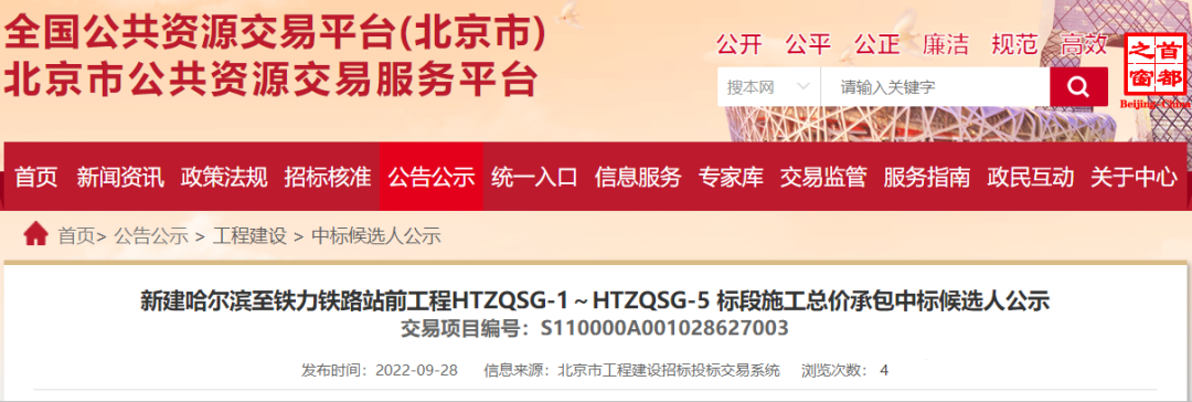 The first winning candidate for this tender section: China Railway Second Bureau Group Co., Ltd., the bid price: 2.377 billion yuan.