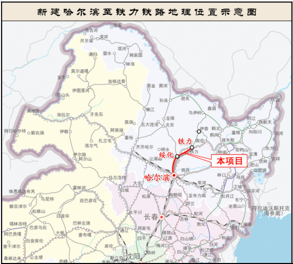 The newly built Harbin-Tieli Railway is located in the central part of Heilongjiang Province, and runs from southwest to northeast. The line starts from Harbin City, passes through Songbei District, Hulan District, Xinglong Town in Bayan County, Suihua City, Qing'an County, and finally ends in Tieli City .