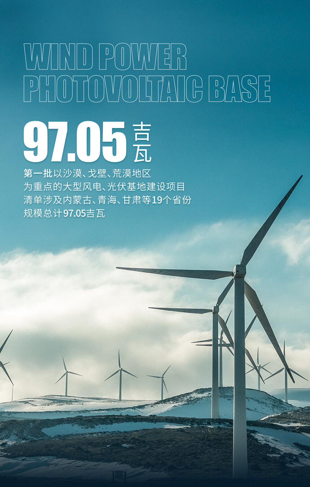 根据国家发改委印发的《第一批以沙漠、戈壁、荒漠地区为重点的大型风电、光伏基地建设项目清单的通知》。第一批以沙漠、戈壁、荒漠地区为重点的大型风电、光伏基地建设项目清单涉及内蒙古、青海、甘肃等19个省份,规模总计97.05吉瓦。