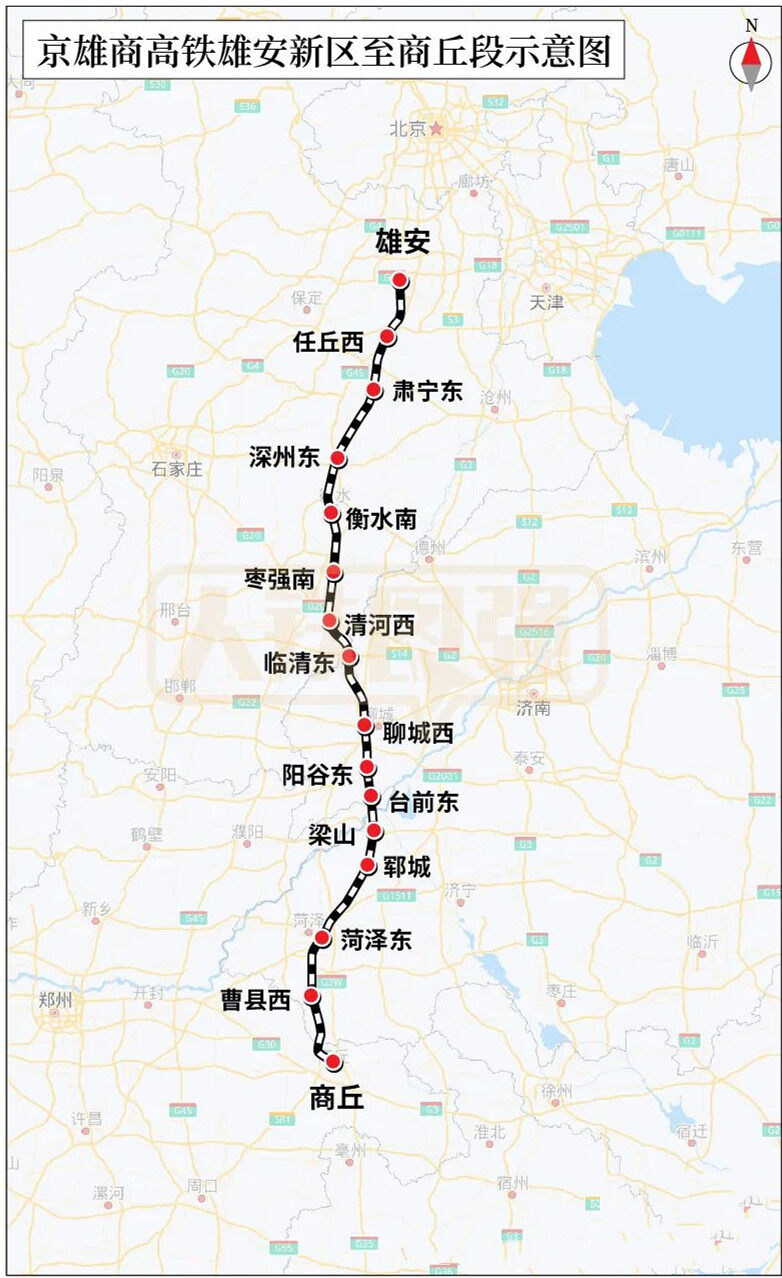 According to reports, the section from Xiongan New Area to Shangqiu of the Beijing-Xiong-Shangxi High-speed Railway, which is under construction this time, has a design speed of 350 km/h, a main line of 552 km in length, and a construction period of 4 years. The line starts from Xiongan Station of the Beijing-Xiong Intercity Railway in the north, passes through Xiongan New District, Cangzhou City, Hengshui City, Xingtai City in Hebei Province, Liaocheng City in Shandong Province, Puyang City in Henan Province, Jining City, Heze City in Shandong Province to Shangqiu City in Henan Province , and finally to Shangqiu Station of the Shanghe-Hangzhou High-speed Railway.