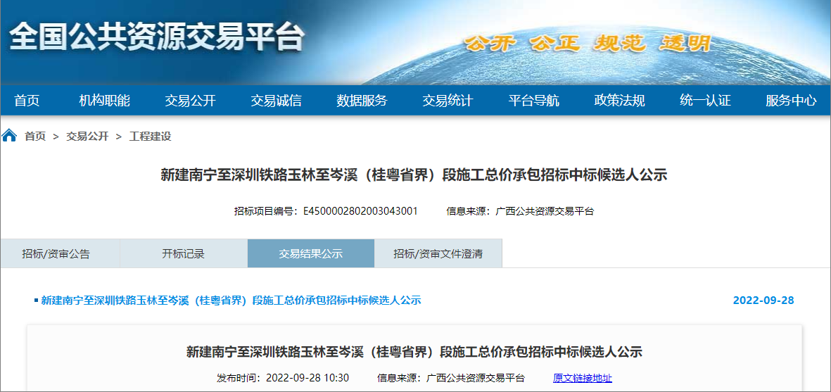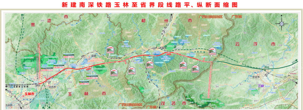 2022年9月28日,新建南宁至深圳铁路玉林至岑溪段施工总价承包招标中标候选人公示发布。南深高铁广西玉林至岑溪段即将进入全面施工阶段,计划工期3.5年。