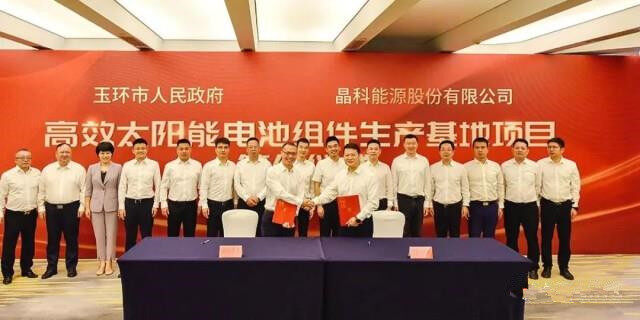 近日,玉环市人民政府与晶科能源股份有限公司签订高效太阳能电池组件生产基地项目投资协议。项目投资近百亿元,总规模为40GW光伏产品,计划分两期实施,全面建成后预计年产值700亿元,将有效助力改变玉环产业格局。市领导周阳、杜年胜、陈彬、詹福章,晶科能源股份有限公司CEO陈康平、副总裁王发万等出席签约仪式,共同见证这一历史时刻。