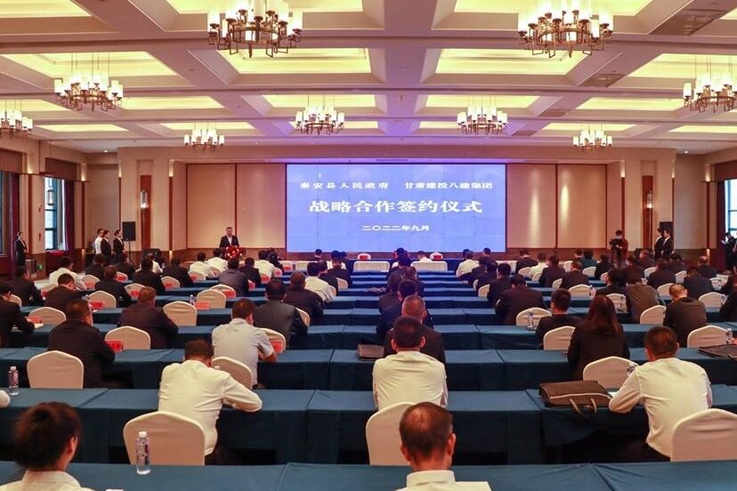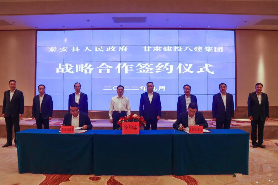 2022年9月29日,秦安县人民政府与甘肃省第八建设集团有限责任公司战略合作协议签约仪式举行。甘肃省建设投资(控股)集团有限公司党委副书记、总经理束水龙,甘肃建投八建集团党委书记、董事长郭想军,秦安县委书记周济,县委副书记、县长王龙强,县人大常委会主任李宽余,县政协主席杨喜春,县领导张俊义、许祖熙、胡继仁、车晓珍、逯虹及省建投和八建集团相关部门负责人,以及县直有关单位主要负责人参加仪式。