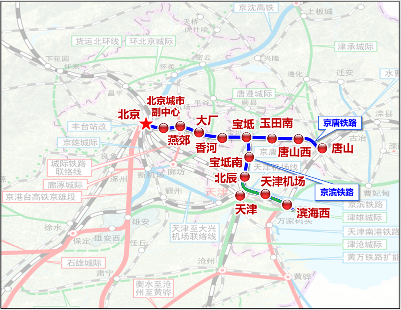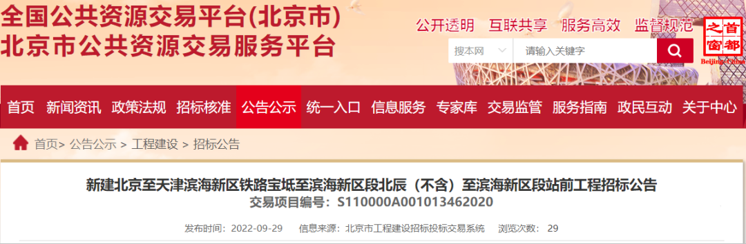 2022年9月29日,新建北京至天津滨海新区铁路宝坻至滨海新区段北辰至滨海新区段站前工程、四电系统集成及相关工程施工总价承包招标公告发布。