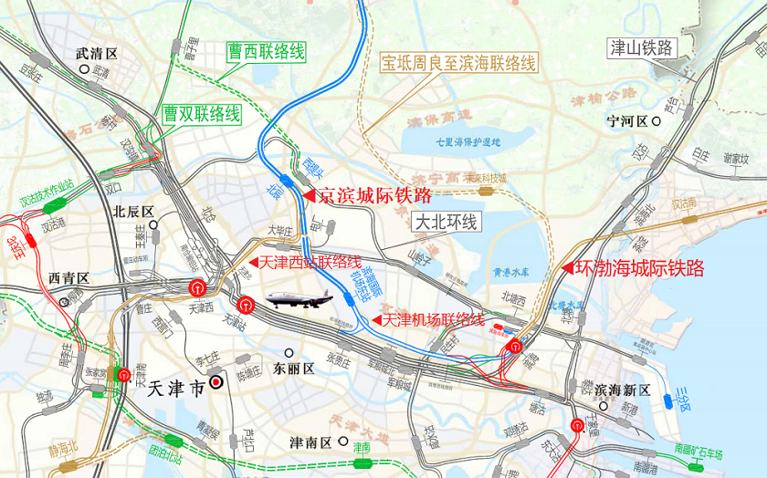 同步实施工程:京滨铁路至天津西联络线工程,上、下行线共计0.95单线公里。天津机场线工程,上、下行线共计0.50单线公里。京滨津潍联络线工程,上、下行线共计0.52单线公里。