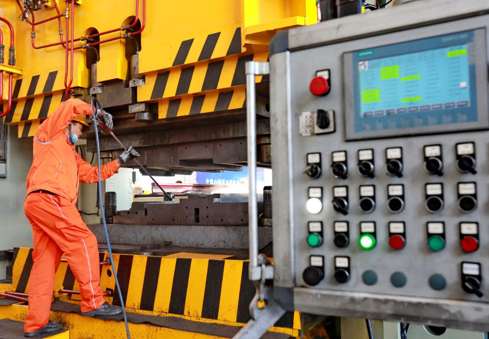 锻压完成后,操作者正在对模具进行润滑