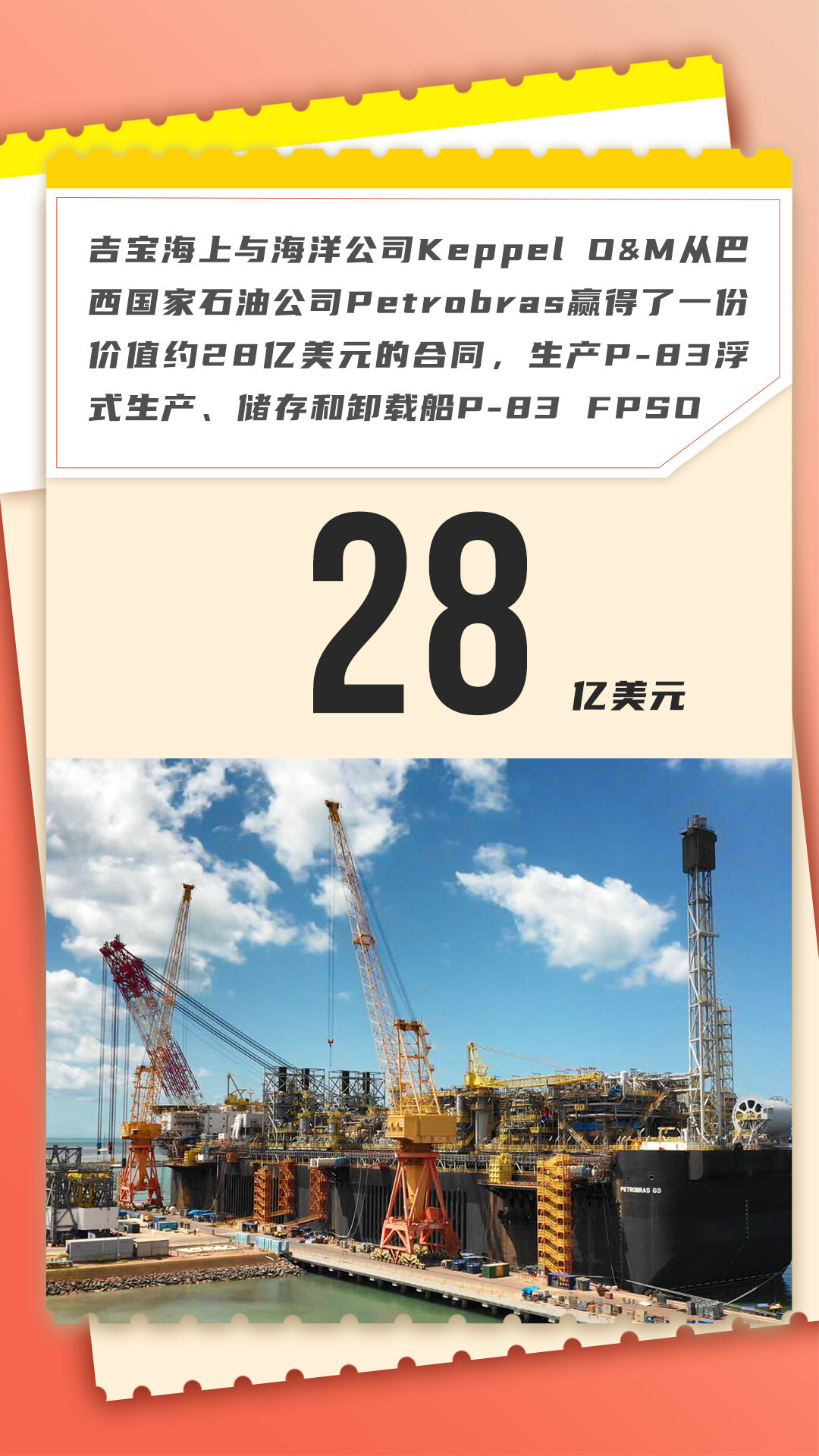 吉宝海上与海洋公司Keppel O&M从巴西国家石油公司Petrobras赢得了一份价值约28亿美元的合同,生产P-83浮式生产、储存和卸载船P-83 FPSO,这是巴西近海Buzios油田开发项目的一部分。该工程、采购和施工合同已授予其全资子公司吉宝造船厂。
