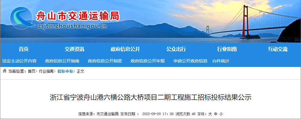 2022年9月29日,舟山市交通运输局发布了浙江省宁波舟山港六横公路大桥项目二期工程施工招标投标结果公示,项目由中国铁建大桥工程局联合体中标,投标报价98.58亿元。