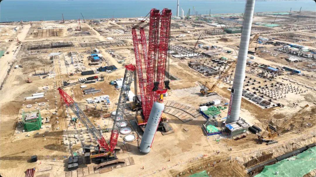2022年9月3日,山东省“一号工程”——裕龙岛炼化一体化项目建设现场,三一SCC98000TM、SCC10000履带起重机合力完成了“260万吨/年渣油加氢装置上行式保护反应器”的吊装任务。