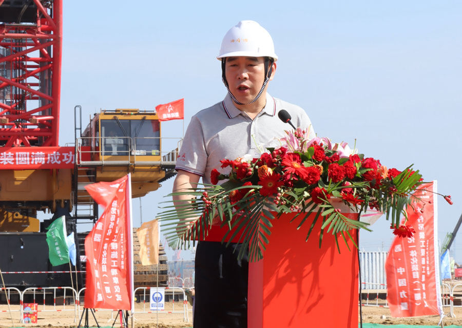 山东海湾吊装工程股份有限公司相关负责人马辰飞介绍:“此次吊装的反应器装置超过1400吨,高32.7米,直径5.6米。为保证安全和效率,采用单机提吊抬送法进行吊装。”