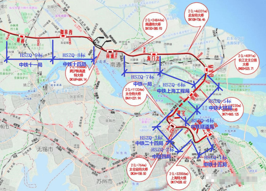 HSZQ-4标:沪宁段正线DK47+041~DK62+402站前及相关工程,正线长度15.36公里。含崇太长江隧道14.25公里、路基工程1.11公里,设盾构管片场1处;无砟轨道施工。