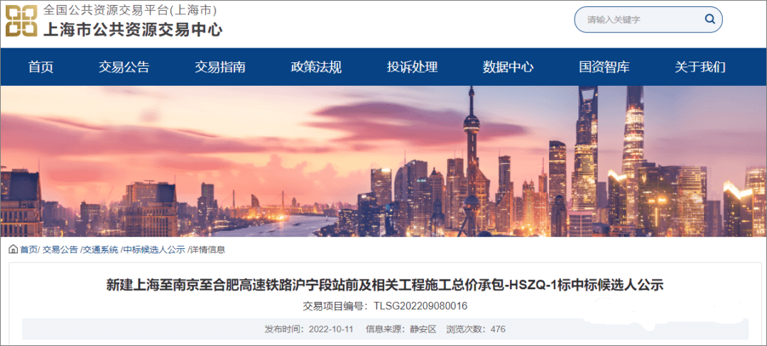 2022年10月11日,新建上海至南京至合肥高速铁路沪宁段站前及相关工程施工总价承包及施工监理中标候选人公示在上海市公共资源交易中心发布。中标施工单位将于本月正式进场施工。至此,沪渝蓉高铁上海至南京至合肥段即将进入全面建设阶段。