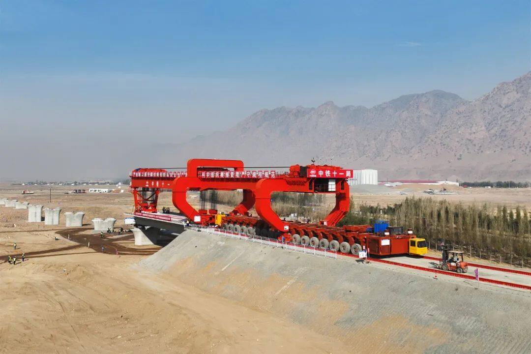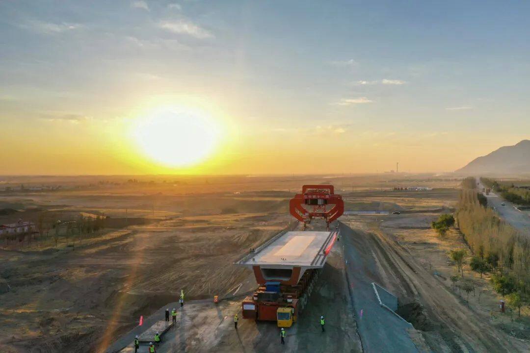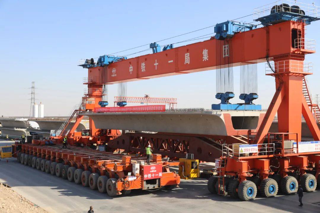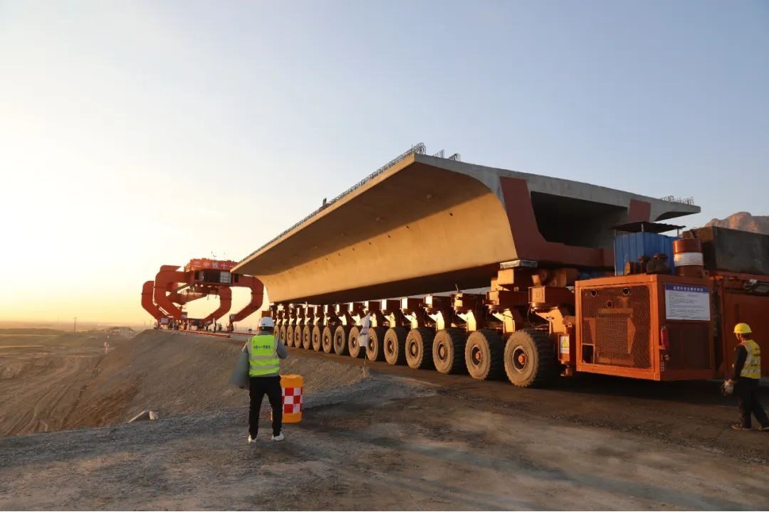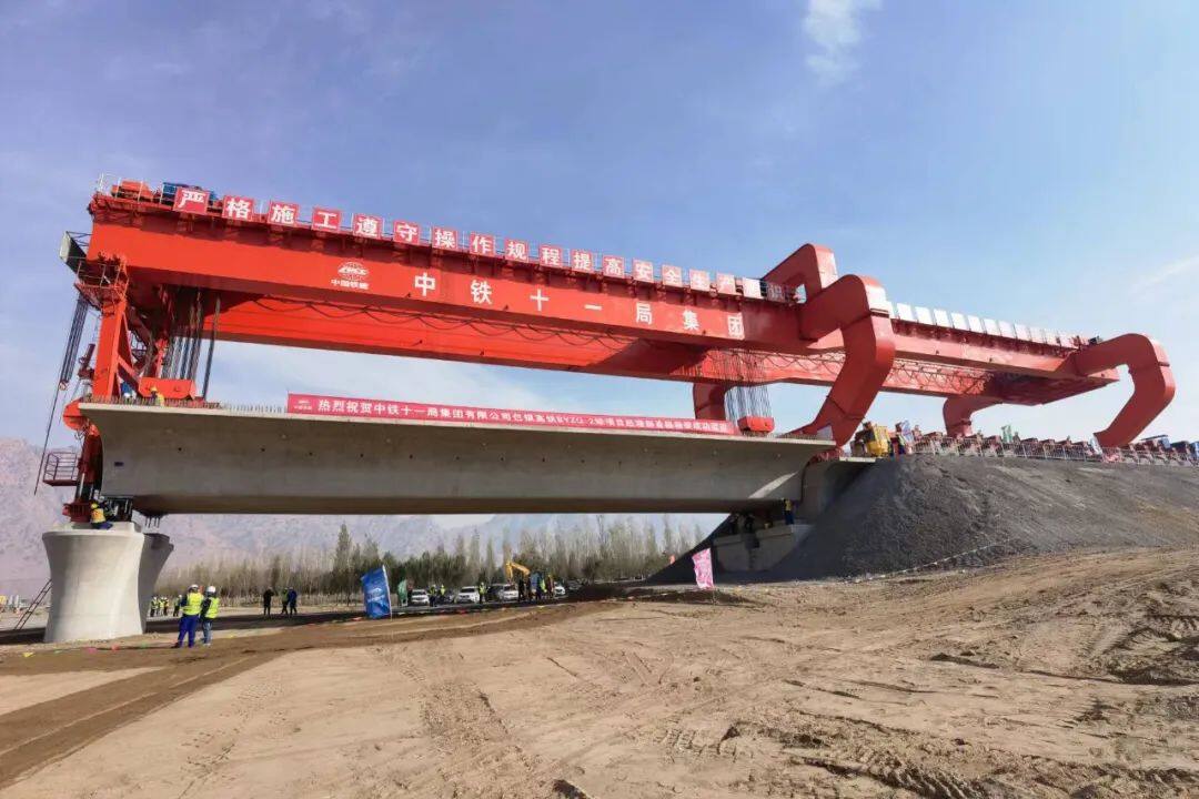 2022年10月12日10时38分,在包银铁路包头至临河段施工现场,随着公司建设者操控着900吨高铁箱梁架桥机,将首榀长32.6米、宽12.2米、高2.69米,重约714.8吨的箱梁稳稳地架设在乌拉特前旗扬水村大桥0至1号桥墩上,这标志着包银铁路包头至临河段首榀箱梁成功架设,拉开了包银铁路上部结构施工的序幕,为后续桥面系施工提供了保障。