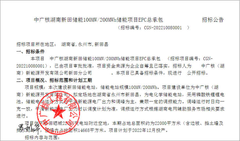 2022年10月12日,中广核、国电电力、国轩高科分别发布了百兆瓦时的储能招标,三大项目规模合计227.5MW/506.68MWh。其中国电电力为内蒙古风电储能系统设备采购,中广核为湖南储能项目EPC、建设目的为平滑新能源电厂出力和调峰为主,国轩高科是庐江基地屋顶分布式光伏及用户侧储能电站项目EPC总承包招标。