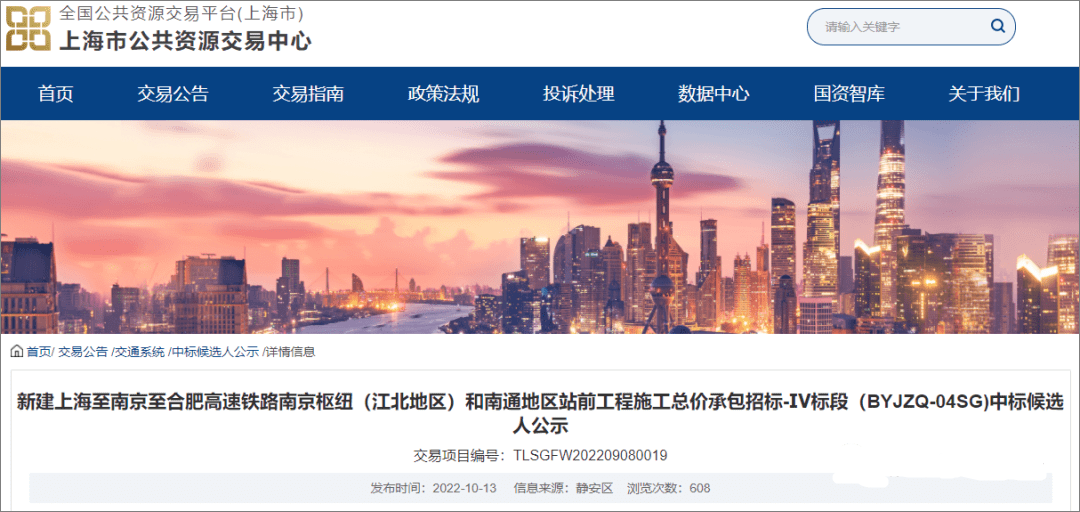 2022年10月13日,新建上海至南京至合肥高速铁路南京枢纽和南通地区站前工程施工总价承包招标中标候选人公示发布。该项目10月将全面开工建设。