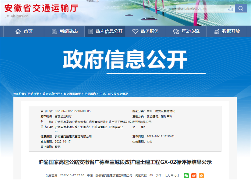 2022年10月17日,安徽省交通运输厅发布了沪渝国家高速公路安徽省广德至宣城段改扩建土建工程标评标结果公示,该项目共分为7个标段,项目概算总投资97.48亿元。