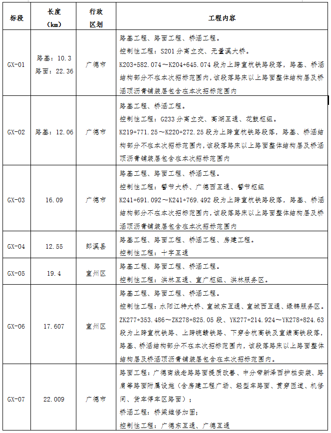 招标范围和标段划分:本次招标范围为沪渝国家高速公路安徽省广德至宣城段改扩建土建工程,包含施工、交验、缺陷期修复等工作内容。本次招标划分为7个施工标段,标段划分如下: