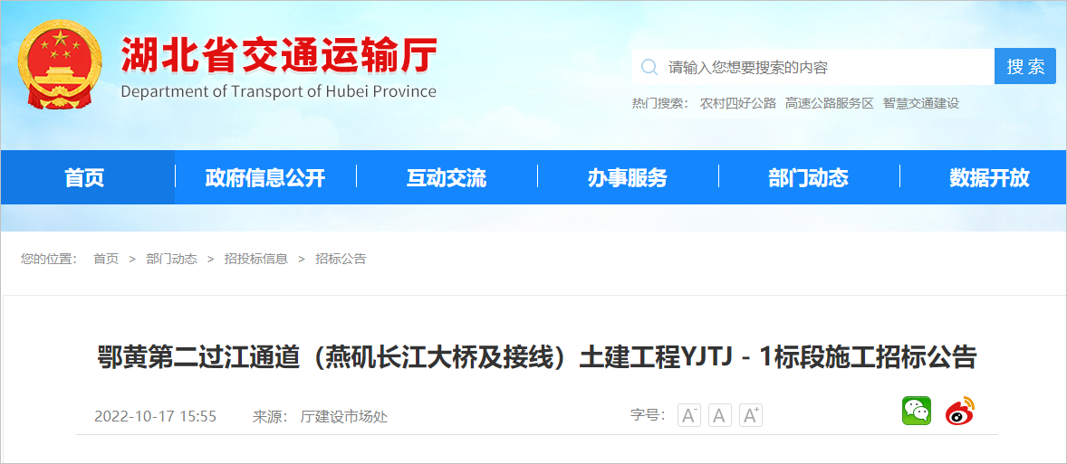 2022年10月17日,湖北省公共资源交易中心发布了鄂黄第二过江通道燕矶长江大桥及接线土建工程YJTJ-1标段施工招标公告,该项目所属行业公路,招标人湖北交投燕矶长江大桥有限公司,项目总投资137.67亿元。