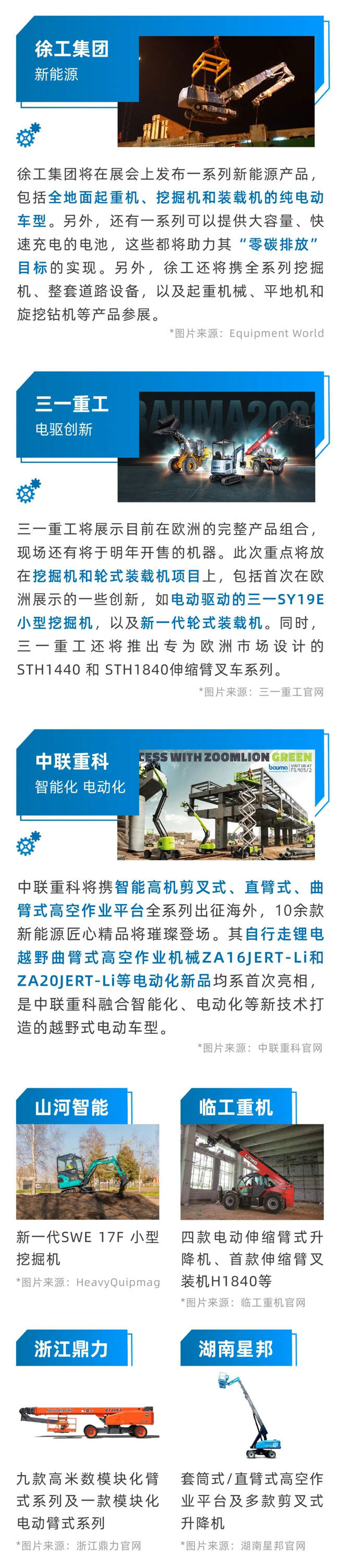 在bauma 2022上,包括徐工集团、三一重工、中联重科、铁建重工、山河智能、临工重机、浙江鼎力、广西美斯达、湖南星邦等中国品牌均将竞秀海外。