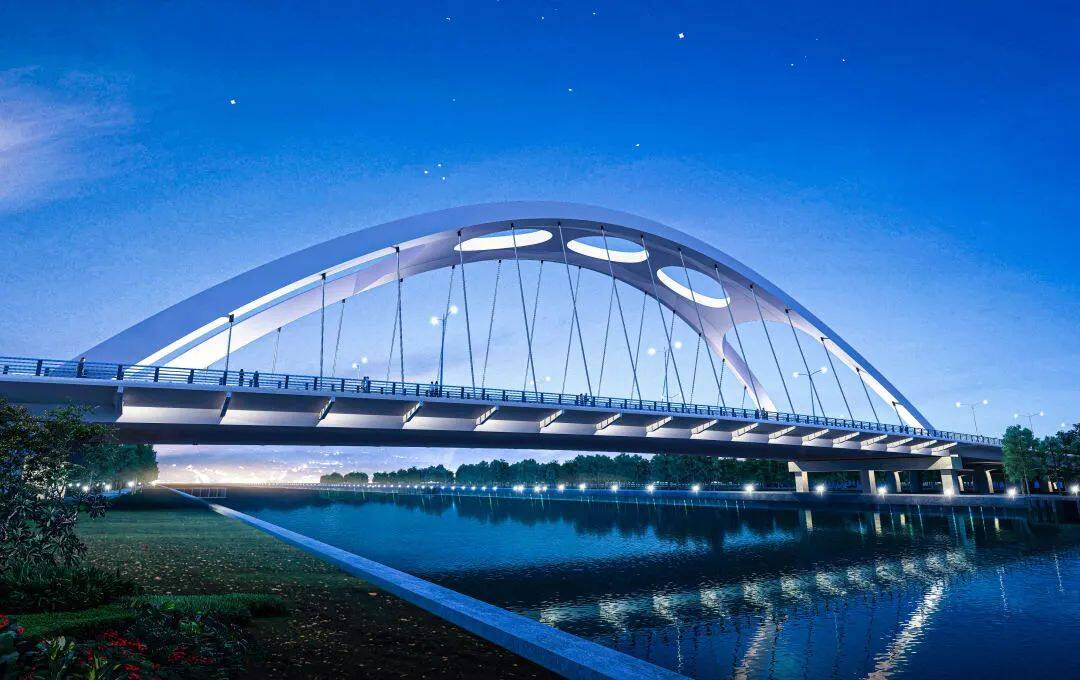 该桥采用少支架分段吊装的方案,对南岸拱脚段、水中段(含大节段系梁和大节段拱肋)、北岸陆上段、北岸拱脚段进行分段吊装,确保了主桥钢系梁顺利吊装,为后续施工奠定了坚实基础。