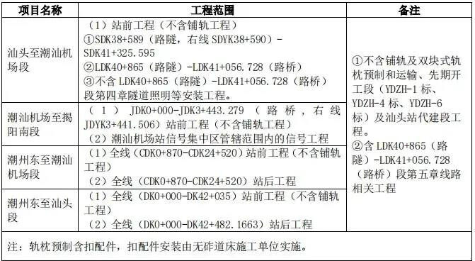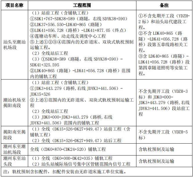 YDZH-7标主要工程内容为汕头至潮汕机场段、潮汕机场至揭阳南段和揭阳南至揭阳段站前、站后工程以及5个项目的铺轨工程。