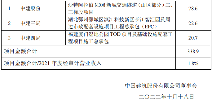 In September 2022, the consortium consisting of CSCEC, Spanish FCC and Saudi SAJCO signed a general contract for the construction of the second and third bid sections of the Saudi Arabian traffic tunnel project in mountainous areas with NEOM Company, a wholly-owned company under the Saudi sovereign fund PIF.