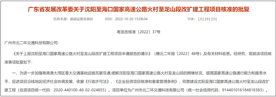 Recently, the Guangdong Provincial Development and Reform Commission issued a reply to the approval of the Shenyang - Haikou National Highway Huocun - Longshan extension project.