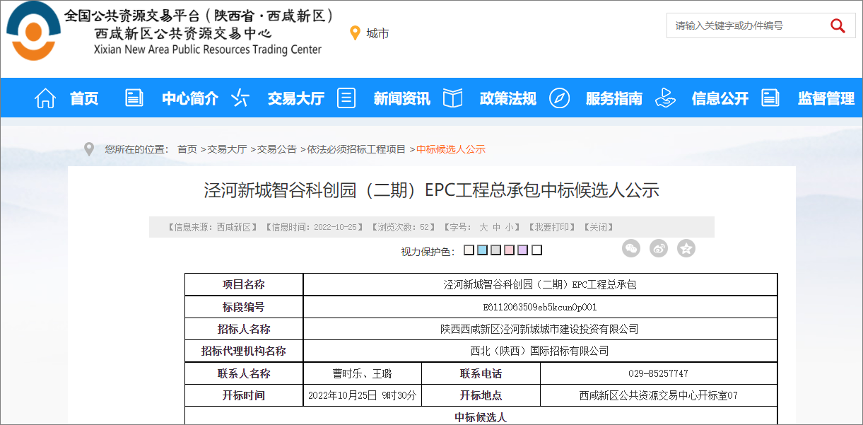 2022年10月25日,陕西省公共资源交易中心发布西咸新区泾河新城智谷科创园二期EPC工程总承包中标候选人公示,项目由中国五冶集团联合体中标,计划工期1825日历天,本次招标估算额约82.98亿元。