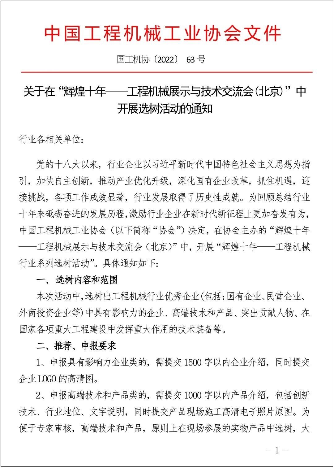 党的十八大以来,行业企业以习近平新时代中国特色社会主义思想为指引,加快自主创新,推动产业优化升级,深化国有企业改革,抓住机遇,迎接挑战,各项工作成效显著,行业发展取得了历史性成就。为回顾总结行业十年来砥砺奋进的发展历程,激励行业企业在新时代新征程上更加奋发有为,中国工程机械工业协会(以下简称“协会”)决定,在协会主办的“辉煌十年——工程机械展示与技术交流会(北京)”中,开展“辉煌十年——工程机械行业系列选树活动”。具体通知如下: