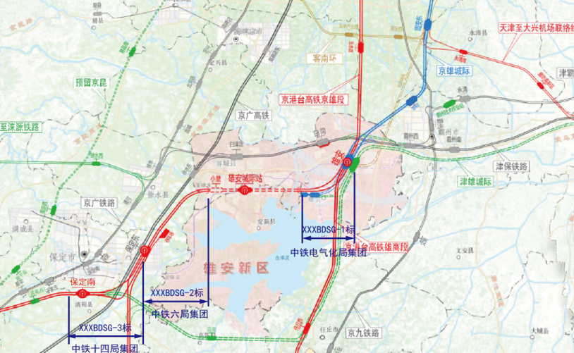 XXXBDSG-1标段:新盖房左、右线特大桥、大清河双线特大桥、梁场1座、征地拆迁。雄安动车所补强工程6994.17m2:雄安城际站宿舍、雄安动车所综合办公楼、雄安动车所维修工区单身宿舍、岗亭及附属工程。里程/范围:雄安站 DIIK105+050~雄保DK115+123.74。
