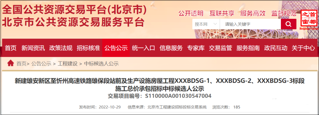 2022年10月29日,新建雄安新区至忻州高速铁路雄保段站前及生产设施房屋工程施工总价承包招标中标候选人公示发布。雄忻高铁全线除雄安新区地下段均已完成施工招投标工作,将于12月份全面开工建设。