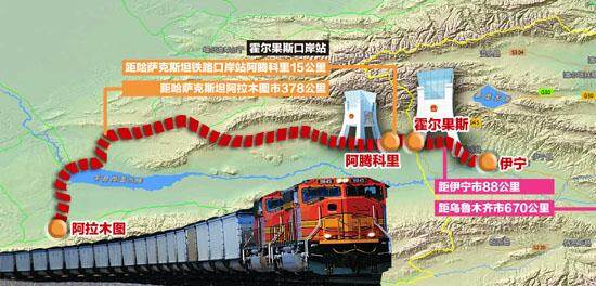实现这次对接的中国境内铁路线为新疆精伊霍铁路(精河-伊宁-霍尔果斯口岸),是新疆第一条电气化铁路,东起兰新铁路西段的精河站,西至中哈边境口岸霍尔果斯站,全长292公里。2011年12月2日,中国与哈萨克斯坦在两国边界实现了铁路接轨,通过铁路部门一年的努力,已完成了口岸站建设的各项任务,形成了过货能力。