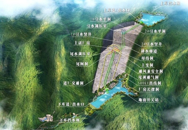 景宁抽水蓄能电站总装机140万千瓦,总投资92亿元,设计年发电量14亿千瓦时,上水库位于沙湾镇蔡湖垟村,下水库位于梧桐乡梧桐坑村。