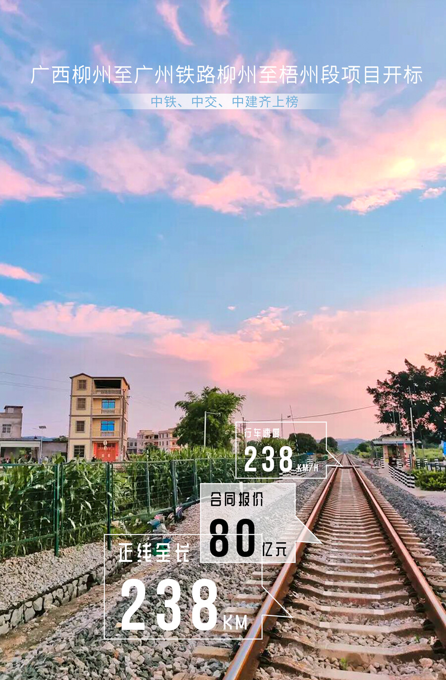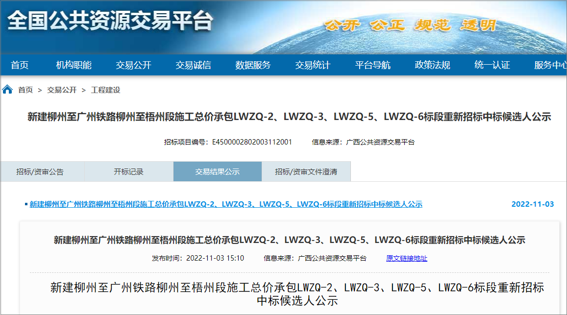 2022年11月3日,新建柳州至广州铁路柳州至梧州段施工总价承包LWZQ-2、LWZQ-3、LWZQ-5、LWZQ-6标段重新招标中标候选人公示已出炉,该项目由中铁大桥局、中铁四局等4家单位分别中标,投标报价约80亿元。
