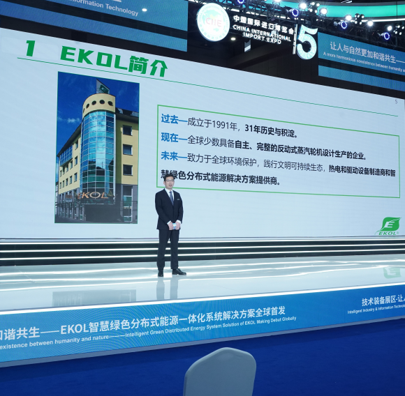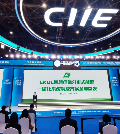 在2022年11月6日第五届进博会全球新品首发现场,EKOL,spol.s r.o “智慧绿色分布式能源一体化系统解决方案”全球首发。多年来,EKOL母公司陕西鼓风机(集团)有限公司(以下简称“陕鼓”)能量回收及输出的装机总功率为23.9GW,相当于年减排二氧化碳1.55亿吨,相当于106%三峡的装机容量,为节能减排和社会经济绿色生态发展助力,向世界传递出该公司为节能减排和社会经济绿色生态发展持续贡献的创新价值。