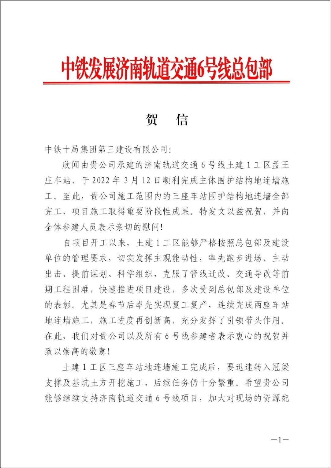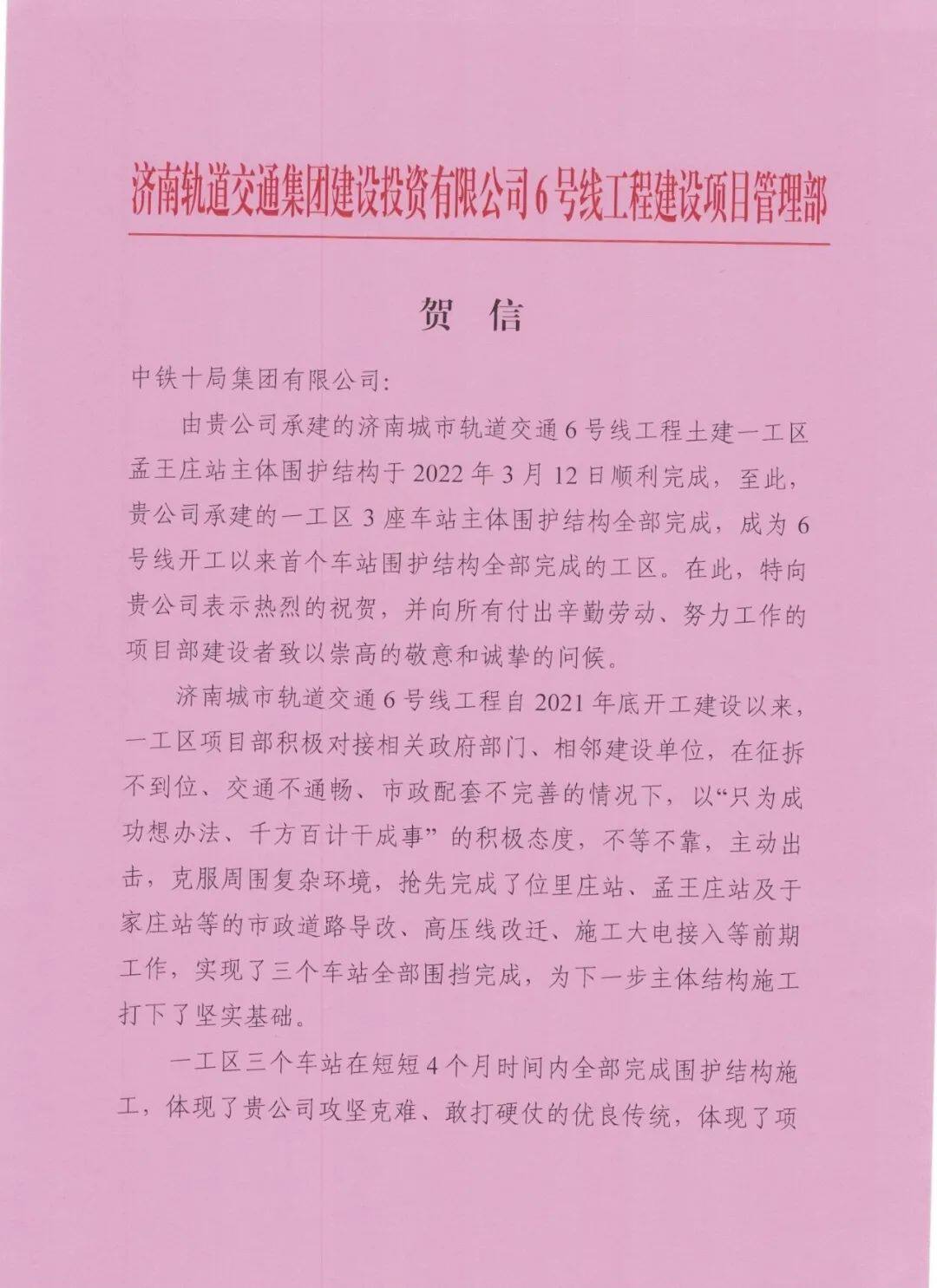 Yu Keshan said that since the commencement of the project, with the strong support and help of all parties, the construction of Jinan Metro Line 6 has made rapid progress and achieved remarkable results. This is the result of the care and help of the construction unit, supervision and design units, as well as the joint efforts of all participants. The staff participating in the construction of China Railway 10th Engineering Group Co., Ltd. should take this event as an opportunity to further give play to their own management, technical and territorial advantages, promote the construction of follow-up projects with high standards, quality and efficiency, work hard and bravely, and contribute to the building of a "safe subway, green subway, smart subway, quality subway"!