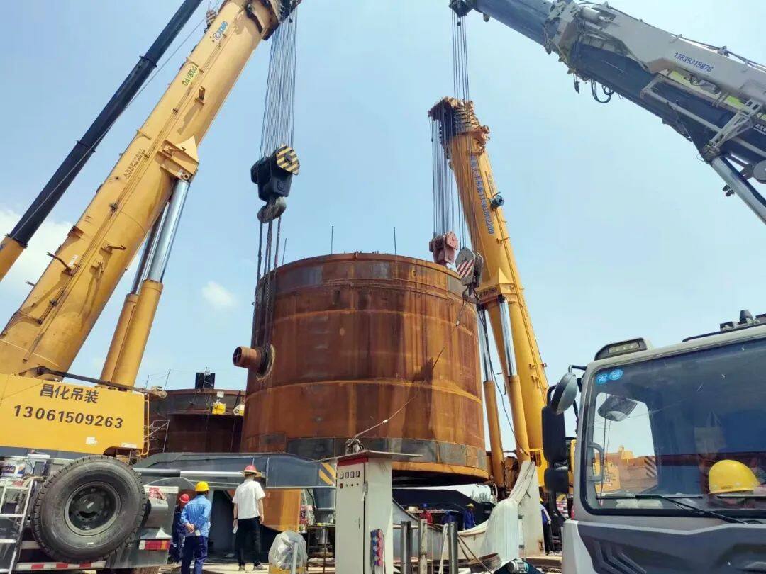 该反应装置设备单重超700t,壳体直径达9000mm,反应管长7m,管数约50000根,且各设备间无管道连接,具有结构紧凑、占地省、热媒容量小、操作方便等优点。反应器轴向、径向温差等性能指标优异,熔盐轴流泵流量可达10000m³/h以上,保证反应热量及时、充分地均匀移出,同时可副产10MPa以上的高品质蒸汽。目前该装置是国内最大、最先进、最可靠的大型正丁烷法顺酐反应装置,与国外进口装置相比,该反应装置价格优势明显,具有良好的市场竞争力。