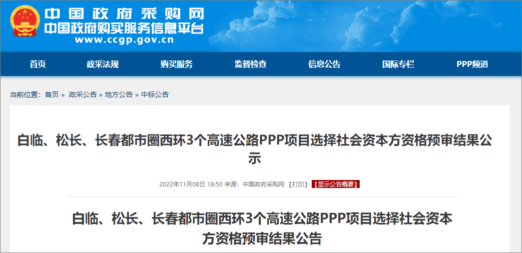 On November 8, 2022, the Chinese government procurement network released the results of the pre qualification of the selection of social capital for PPP projects of Bailin, Songchang and West Ring Expressway in Changchun Metropolitan Circle. Six companies, including China Railway Construction Chongqing Investment Group and Shanxi Road and Bridge Construction Group, won the bid in advance, with a total investment of 31.71 billion yuan.