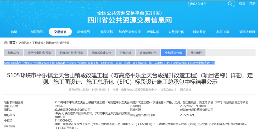2022年11月9日, 陕西路桥集团收到四川省S105线邛崃市平乐镇至天台山镇段改建工程设计施工总承包项目中标通知书。该项目采用设计施工总承包模式,路线全长约34公里,中标金额3.145亿元,工期300日历天,是目前集团公司省外中标的合同金额最大的设计施工总承包项目。