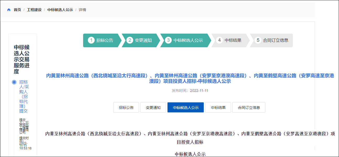 2022年11月11日,安阳市公共资源交易中心发布了内黄至林州高速公路西北绕城至沿太行高速段、内黄至林州高速公路安罗至京港澳高速段、内黄至鹤壁高速公路安罗高速至京港澳段项目投资人中标结果,项目由中国葛洲坝集团股份有限公司牵头,与葛洲坝集团交通投资有限公司等7家单位组成的联合体中标,项目估算总投资约139.28亿元。