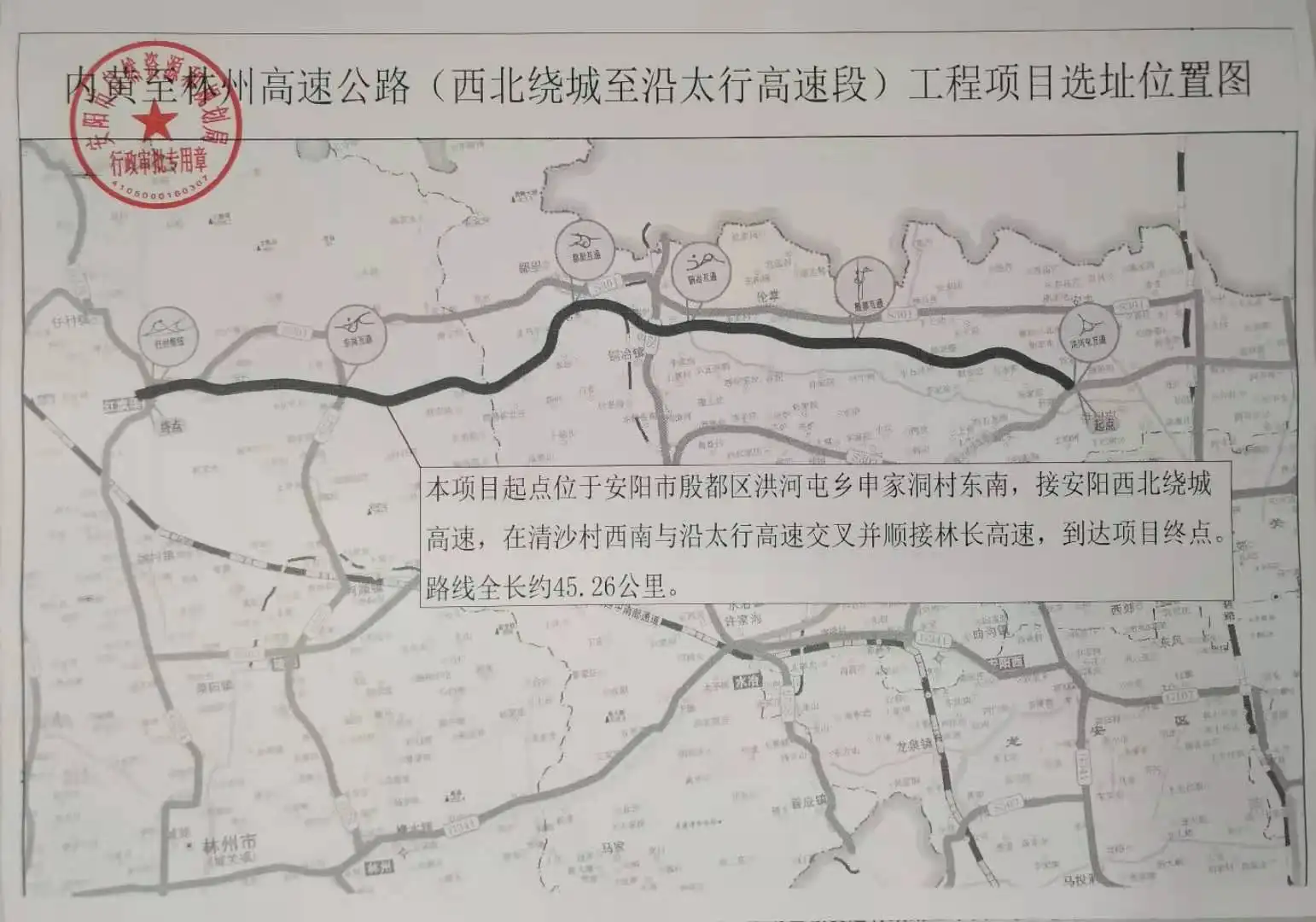 内黄至林州高速公路西北绕城至沿太行高速段:起于安阳市殷都区洪河屯乡申家洞村南侧,接安阳西北绕城高速公路,向西经伦掌镇南、铜冶镇北、都里镇南,林州市东岗镇南,在任村镇南与在建的沿太行高速公路安阳段交叉,并顺接林长高速,到达项目终点,路线全长约43.269公里。