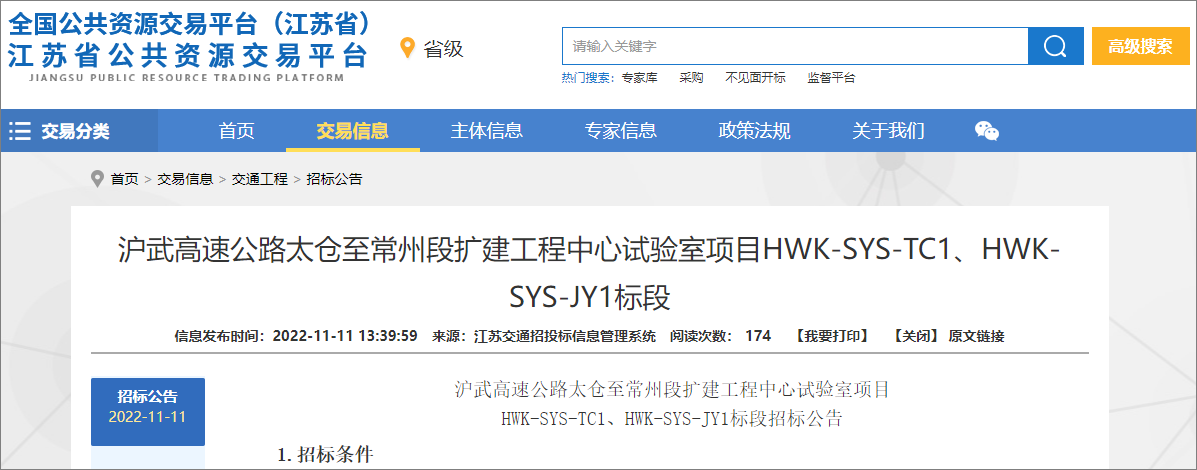2022年11月11日,江苏省公共资源交易网发布了沪武高速公路太仓至常州段扩建工程中心试验室项目HWK-SYS-TC1、HWK-SYS-JY1标段招标公告,该项目所属行业公路,招标人江苏省交通工程建设局,项目总投资360.5亿元。