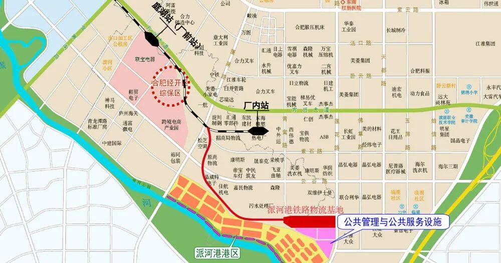 合肥派河港铁路物流基地位于派河北侧、紧邻派河港,为综合性公铁水联运货场,自金源热电厂专用线厂内站西端接轨,新建线路长约3.5公里,新设派河站。