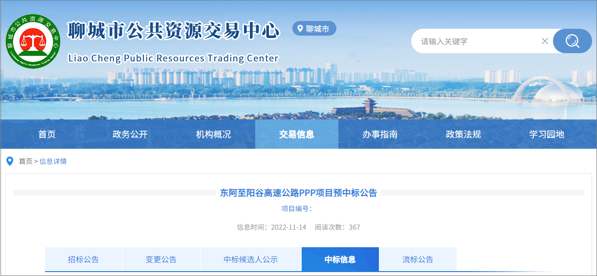2022年11月14日,山东聊城市公共资源交易中心发布了山东东阿至阳谷高速公路PPP项目中标候选人公示,由中国铁建投资集团联合体中标,投资估算总金额79.1亿元。