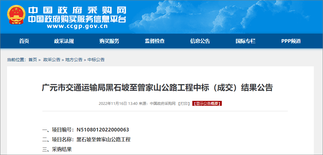 2022年11月16日,中国政府采购网发布了广元市交通运输局黑石坡至曾家山公路工程中标结果公告,本项目总预算为55.6亿元。