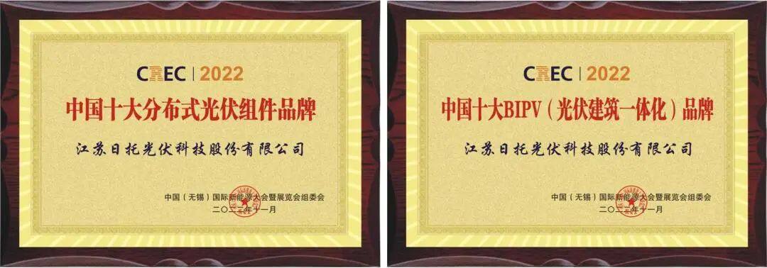近期,由中国国际商会、江苏省贸促会、无锡市人民政府联合主办的2022年 CREC无锡展正式举行。日托光伏凭借高端高质量的光伏组件,荣获主办方颁布的“中国十大分布式光伏组件品牌”和“中国十大BIPV(光伏建筑一体化)品牌”两项大奖。