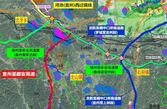 梧州-乐业公路鱼峰至宜州段PPP项目,起于来宾市象州县小太阳村北侧,设置十字枢纽互通式立交与 G65 梧州至柳州高速公路、鹿寨至钦州港公路柳州至覃塘段相接,路线总体自东向西布线,经柳州市鱼峰区里雍镇南侧、穿山镇北侧,依次跨越柳州至武宣高速公路、国道G209、G72泉州至南宁高速公路后,转向西北,在百朋镇南侧依次跨越柳南客运专线、湘桂线两条铁路,于三都镇西南侧跨越国道G322,路线继续向西,在土博镇南侧的甘龙村上跨柳合南高速公路,之后从来宾市忻城县欧洞乡北侧经过,终于河池市宜州区石别镇北侧,设置十字枢纽互通式立交与规划纵8线桂林龙胜至峒中公路、河池宜州西过境线公路连接,路线全长115.354km。