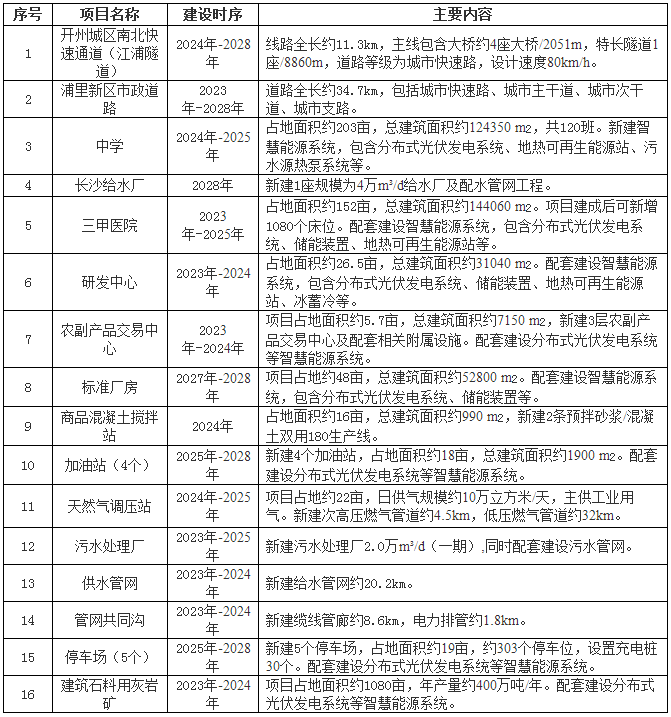 市政基础设施项目:包括开州城区南北快速通道(江浦隧道)、浦里新区市政道路、停车场、天然气调压站、污水处理厂、给水厂、供水管网、管网共同沟。